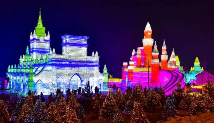 冰雪大世界以冰雪为主题,打造出一个宛如童话世界的冰雪乐园。这里有各种各样的冰雪雕塑,形态各异,栩栩如生,让人仿佛置身于一个冰雪的梦境中。每当夜幕降临,华灯初上,整个冰雪大世界都会被五彩斑斓的灯光照亮,显得更加梦幻迷人。